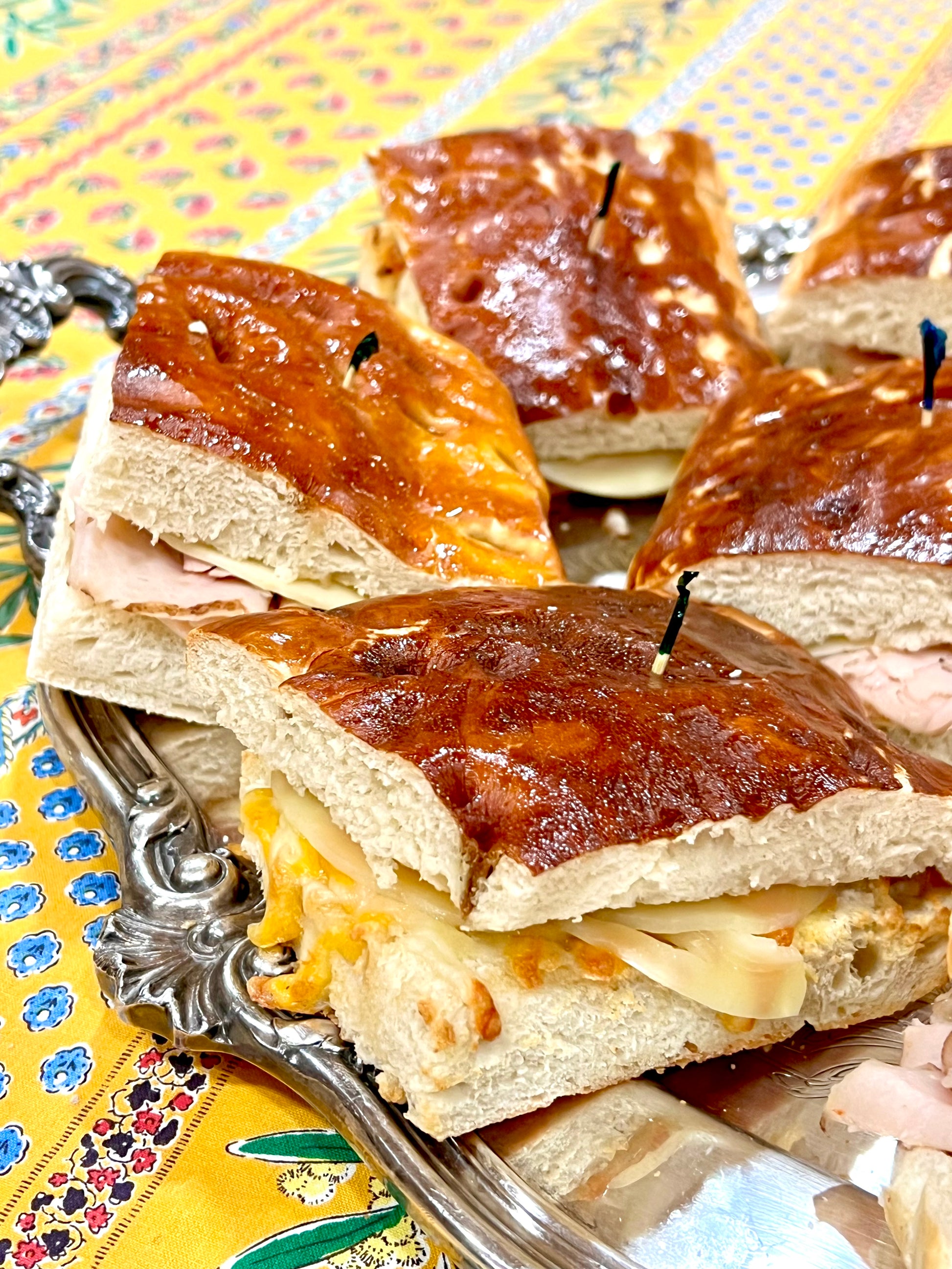 Our pillowy soft Pretzel focaccia is the star of these sandwiches! Our focaccia is brushed liberally with olive oil when it comes out of the oven. We slice the focaccia in half horizontally and fill it with a variety of meats, cheeses and vegetables along with a generous serving of garlic aioli.