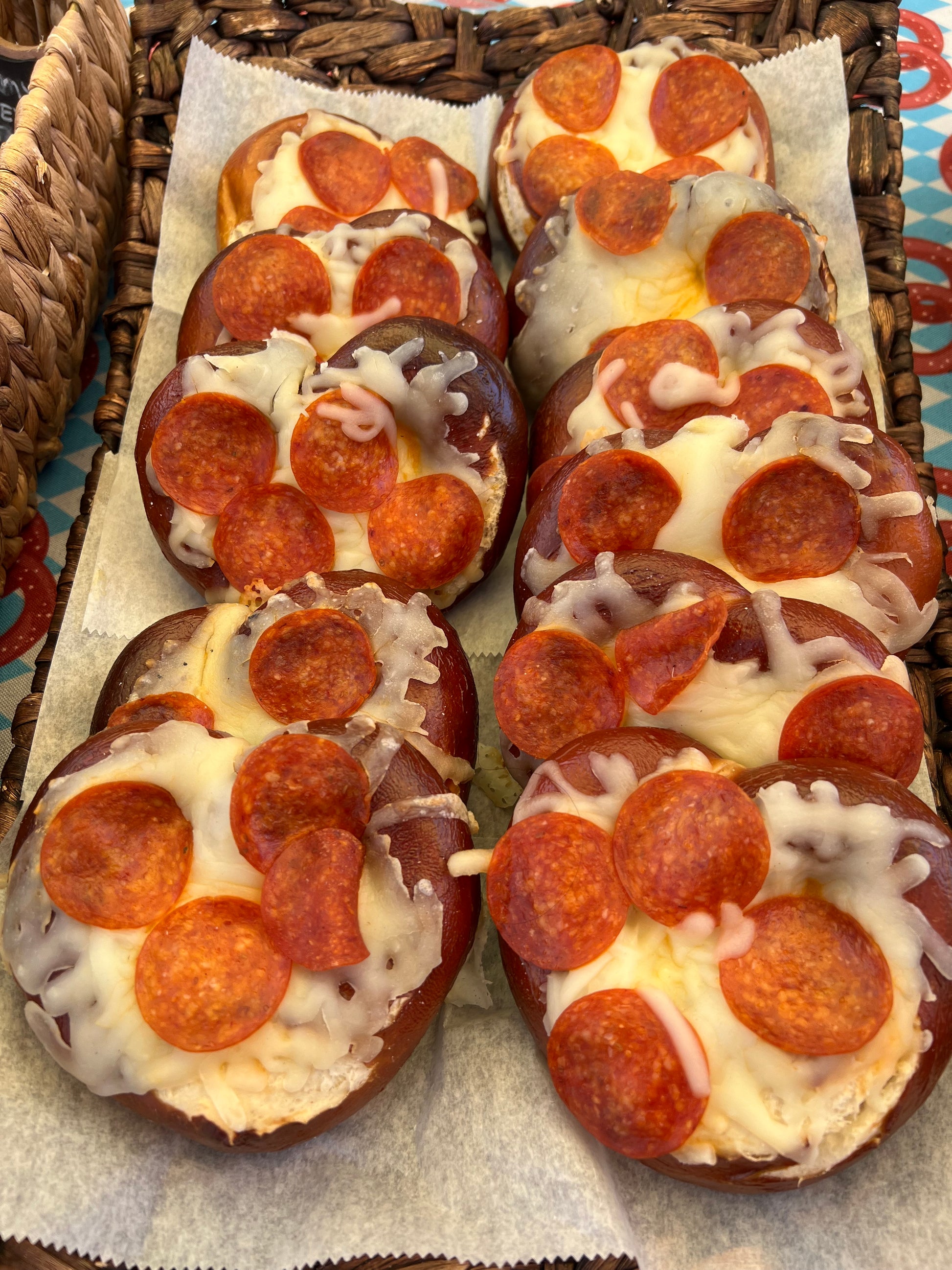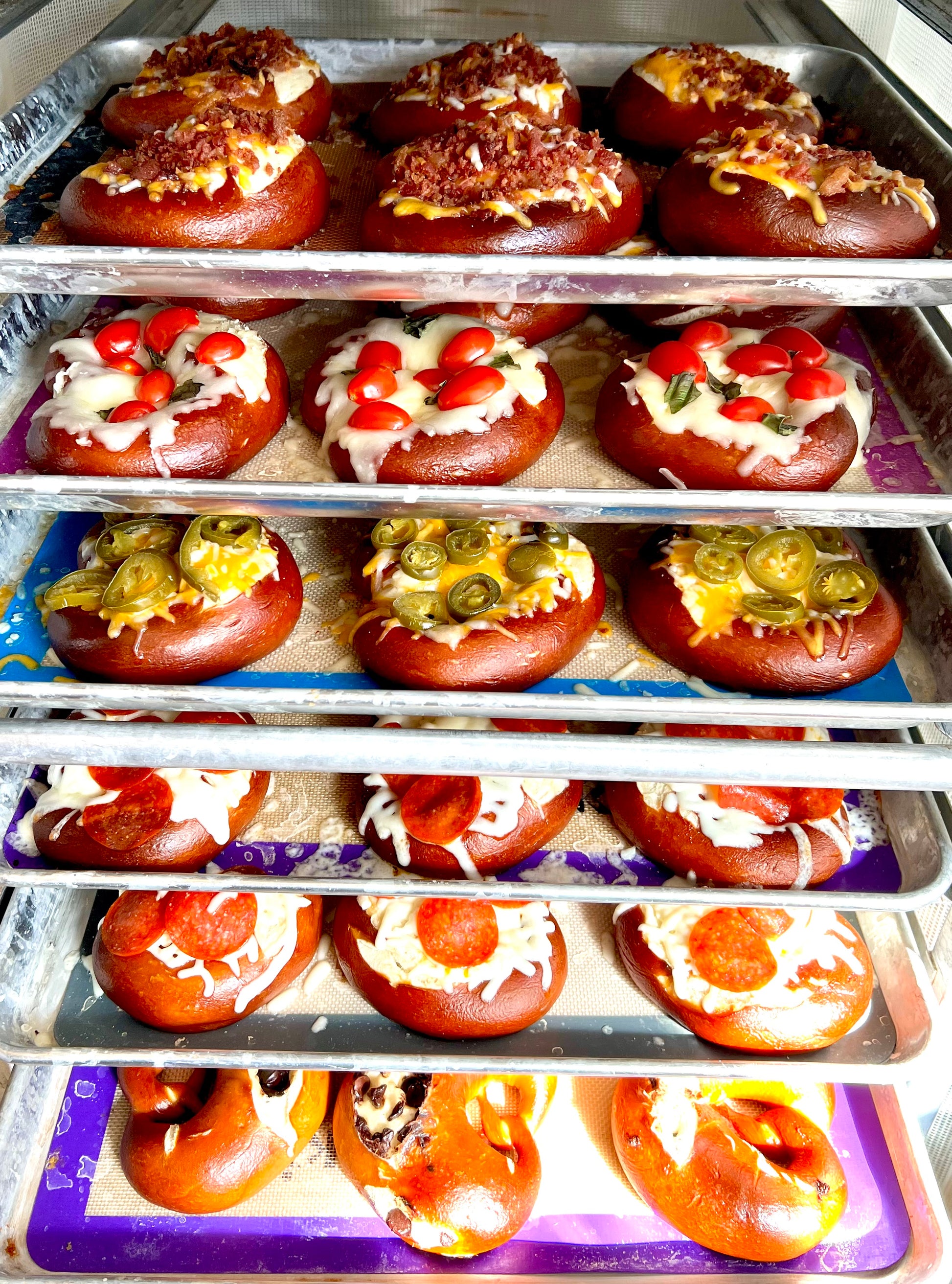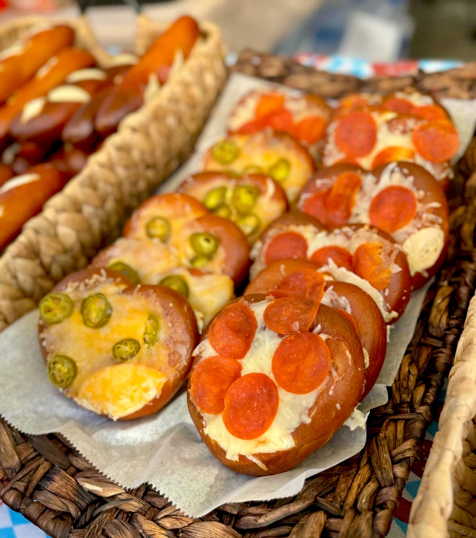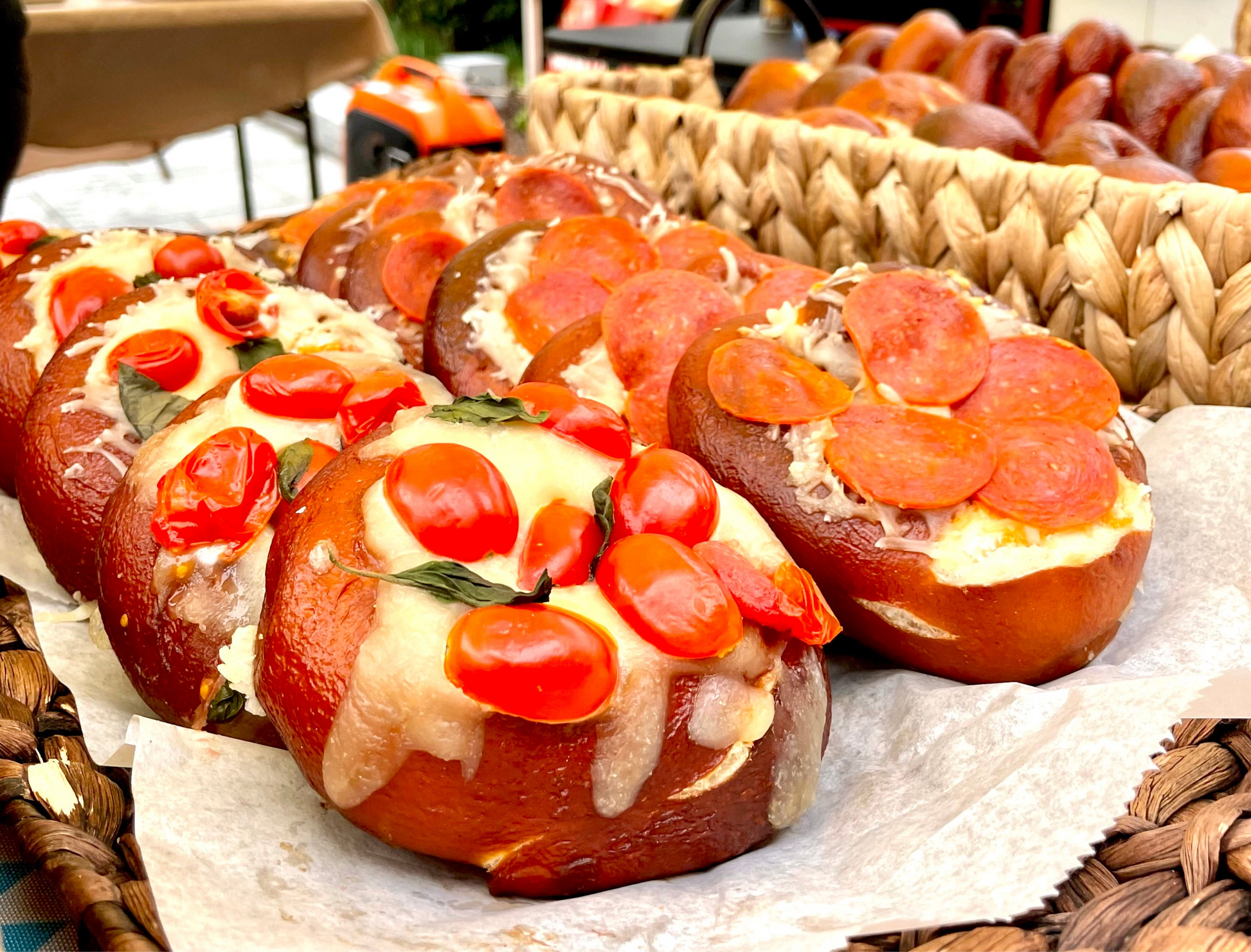 We offer a wide selection of savory and sweet topped pretzels, from pepperoni mozzarella, jalapeño cheddar, mozzarella/genoese pesto/cherry tomato and more! These tasty morsels freeze beautifully! Buy a dozen to keep in the freezer for a quick snack on the go!