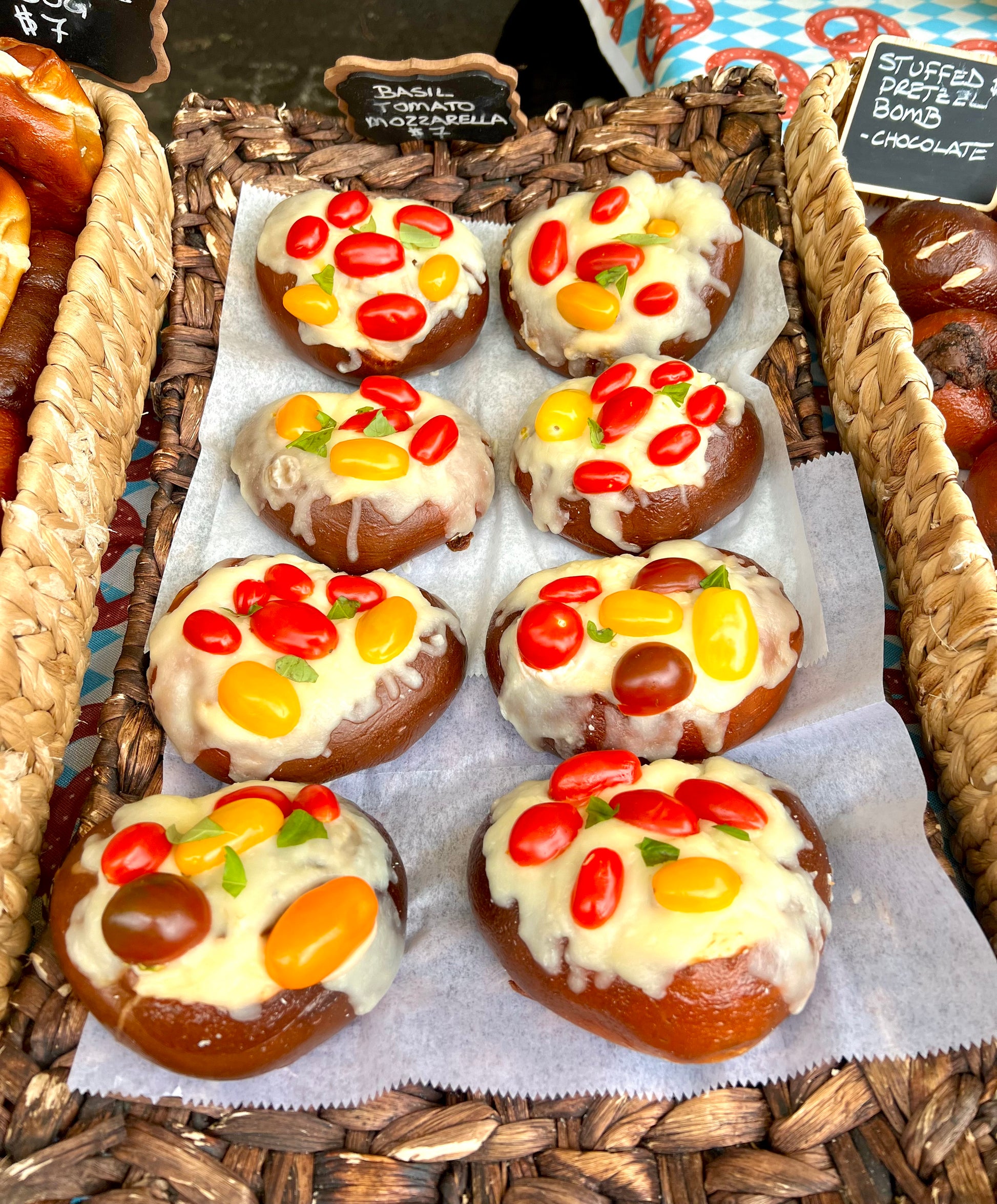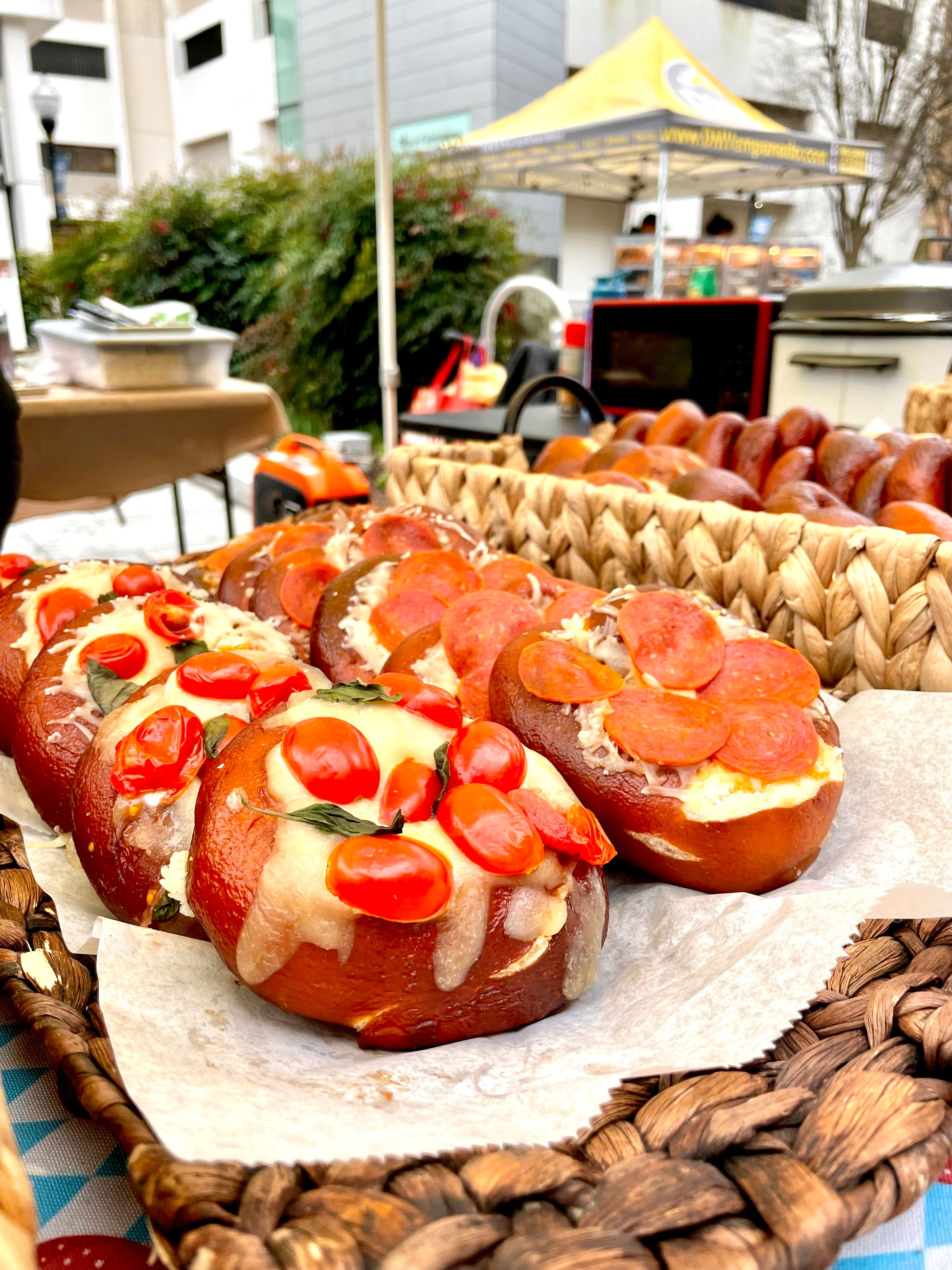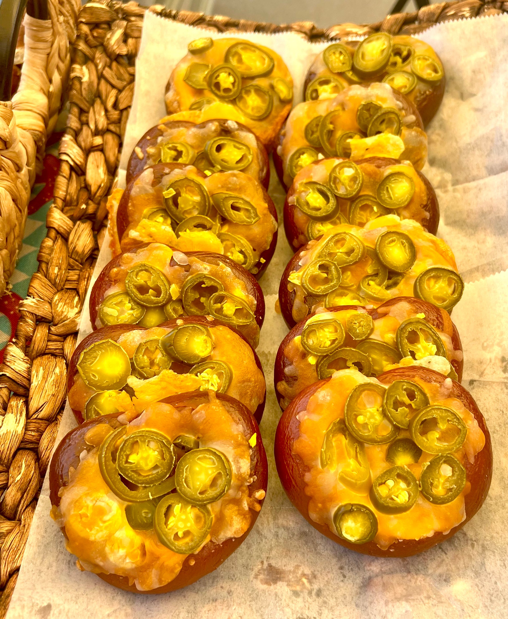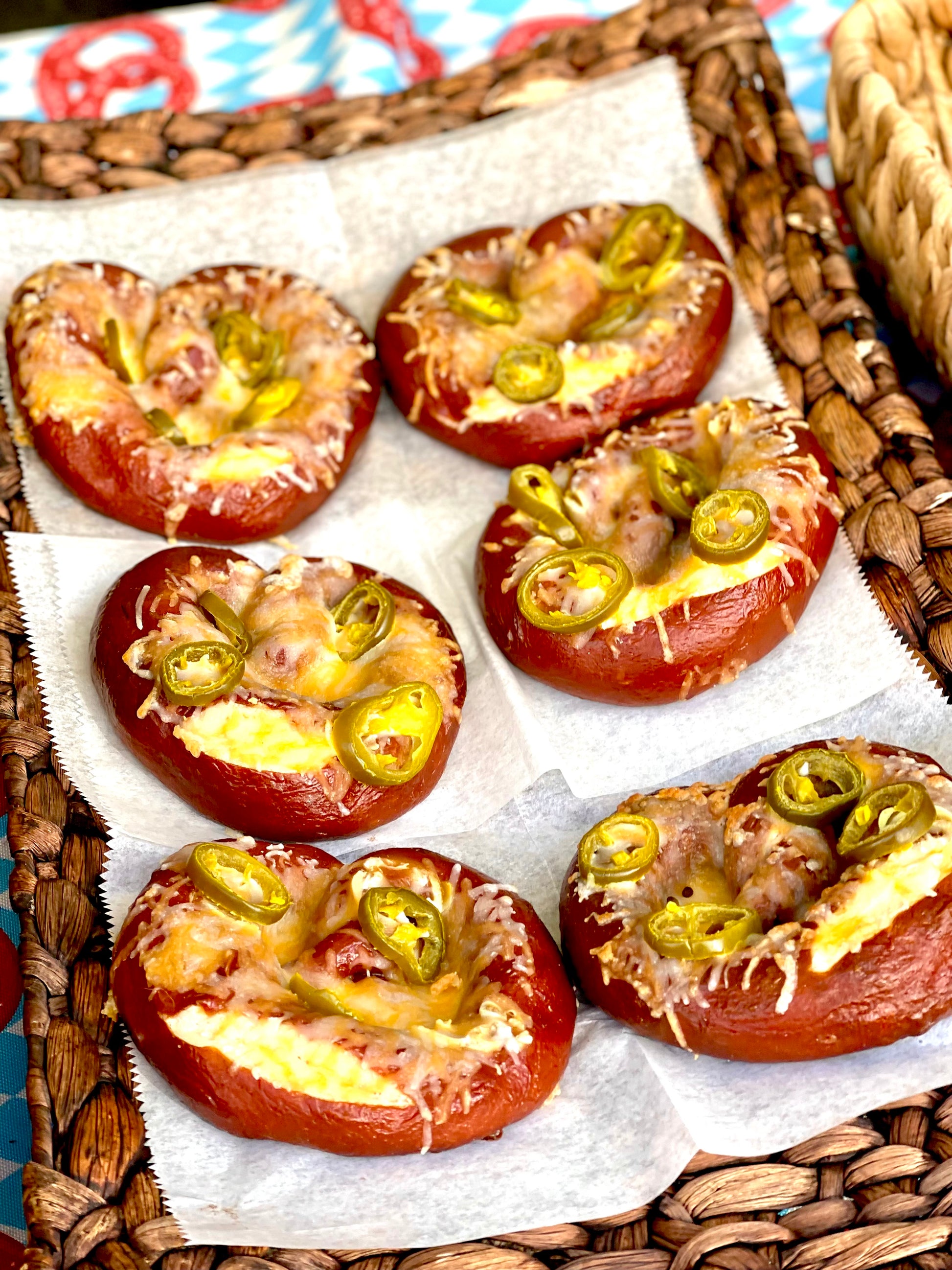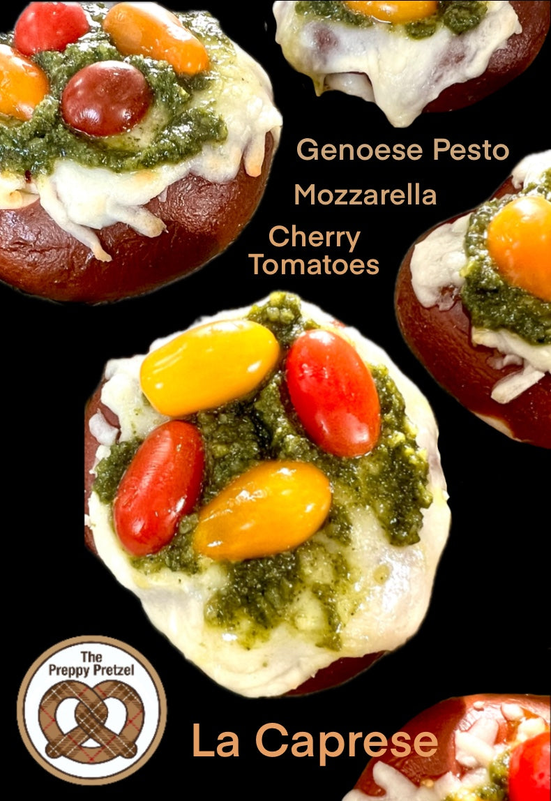 We offer a wide selection of savory and sweet topped pretzels, from pepperoni mozzarella, jalapeño cheddar, mozzarella/genoese pesto/cherry tomato and more! These tasty morsels freeze beautifully! Buy a dozen to keep in the freezer for a quick snack on the go!
